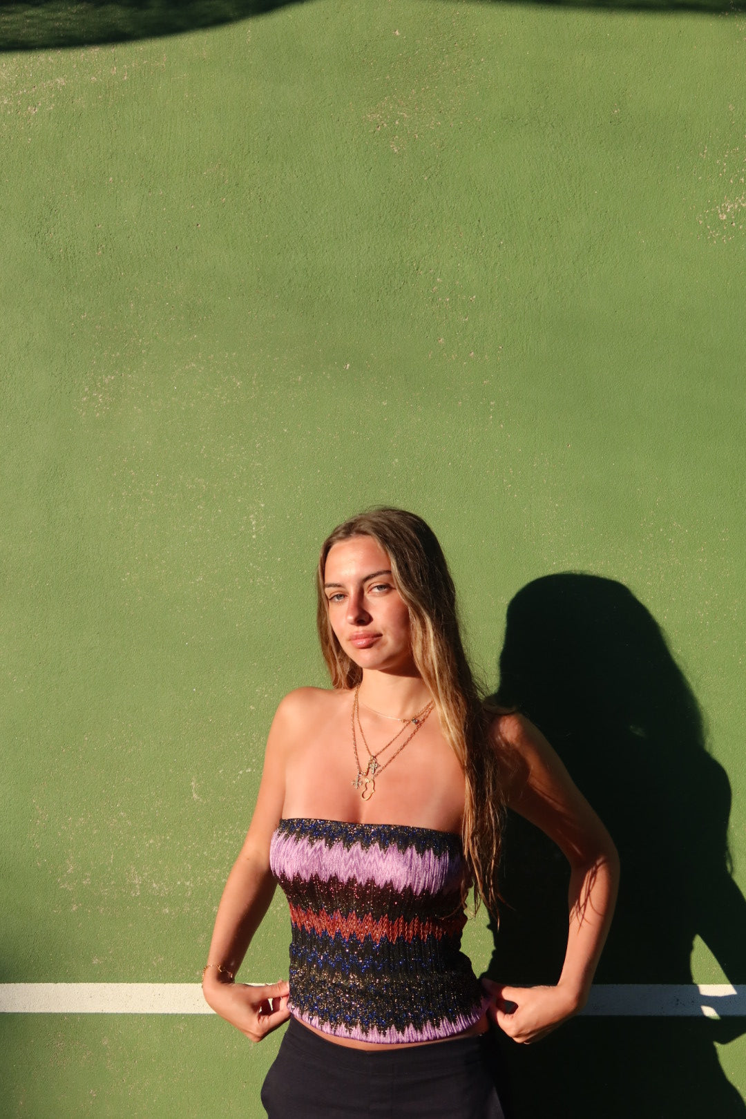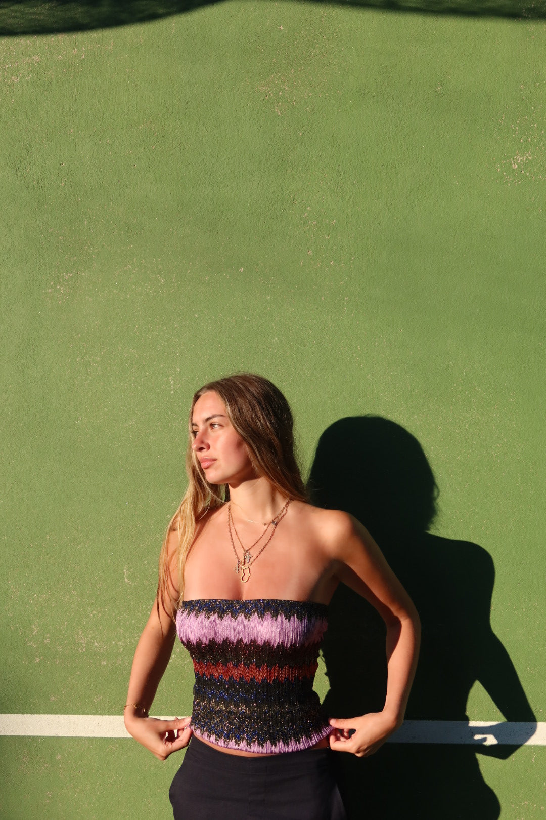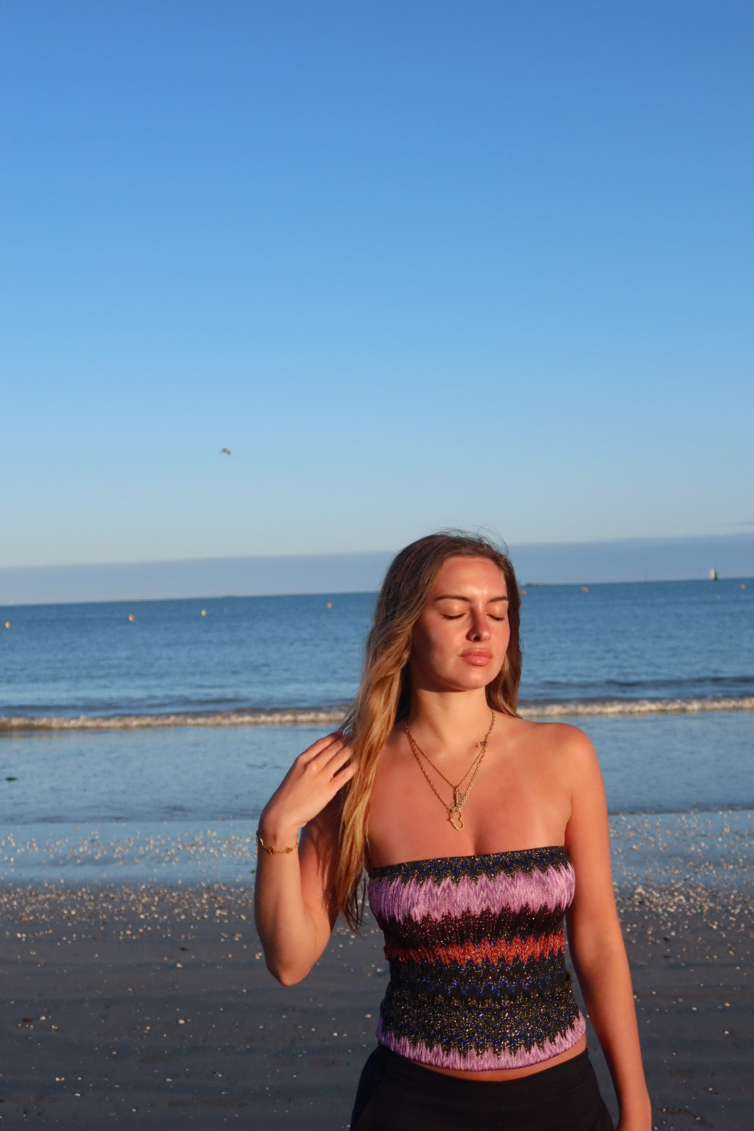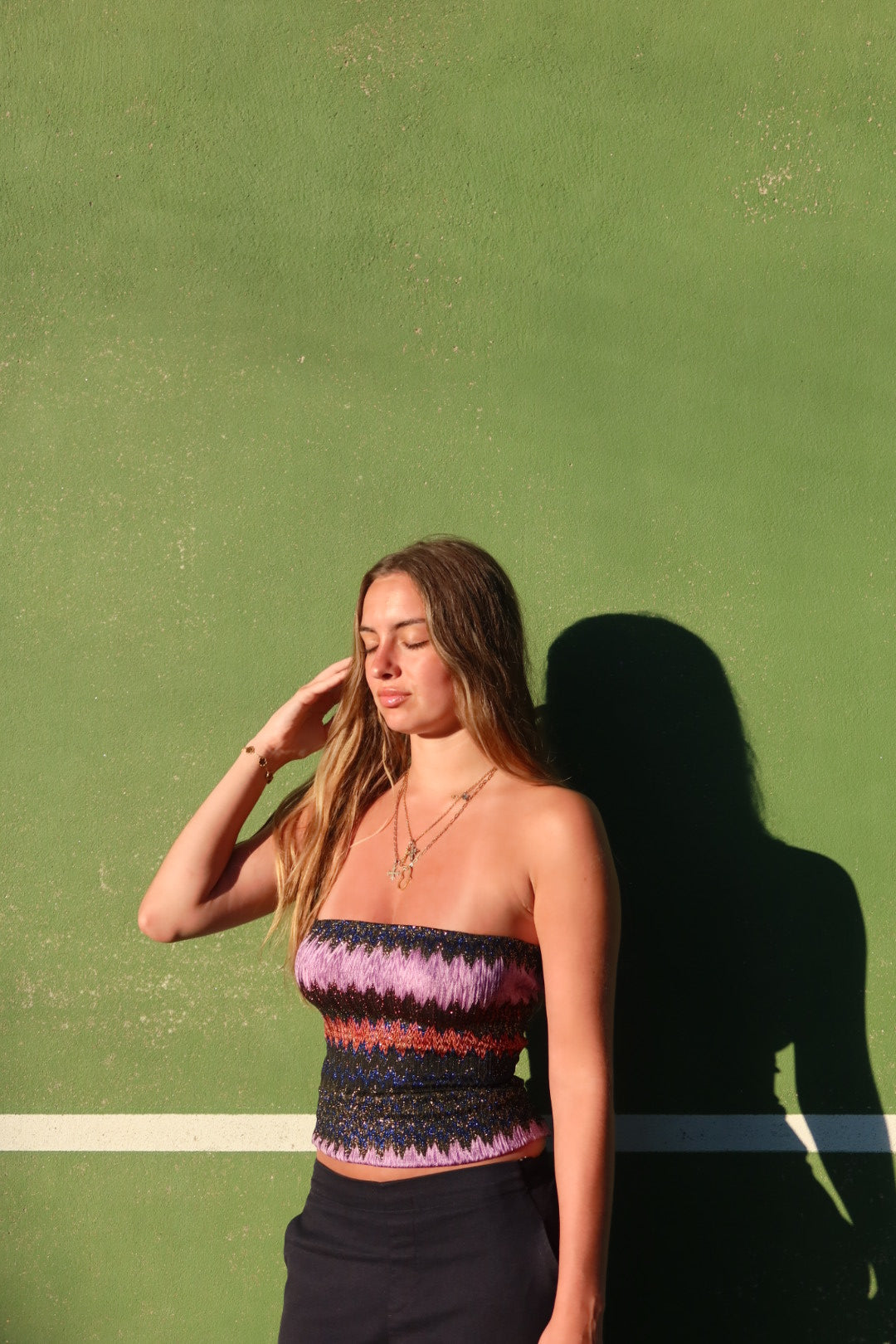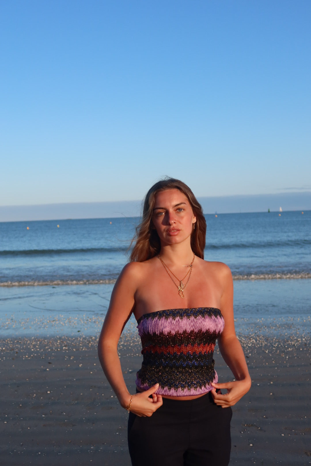 Osez le style audacieux avec notre top Naële, un bandeau aux allures bohèmes et résolument tendance. Son motif zigzag multicolore, relevé de fils scintillants, attire tous les regards et apporte une touche de peps à votre look.