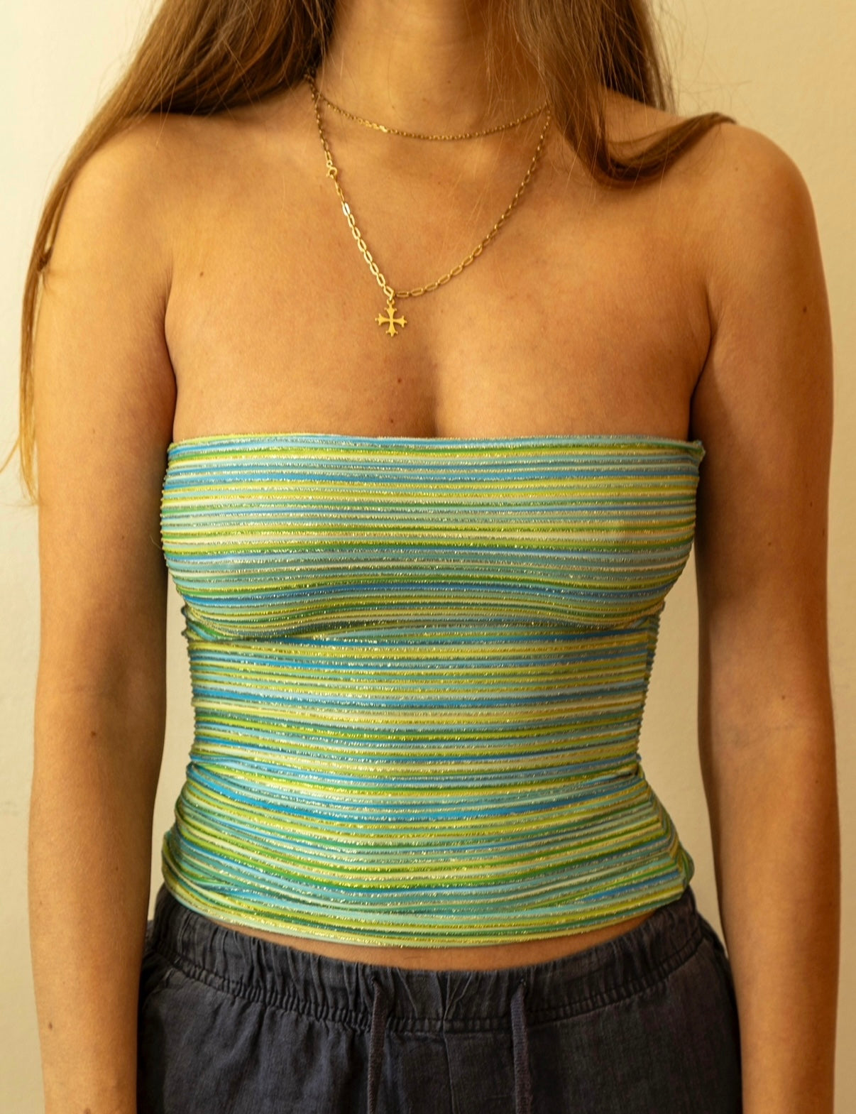 Osez le look lumineux et audacieux avec ce top bandeau en lurex vert. Confectionné dans un tissu stretch et pailleté, il se distingue par ses fines rayures horizontales aux reflets métallisés, dans des tons de vert, turquoise et jaune. Ce modèle sans bretelles épouse la silhouette tout en confort et légèreté, parfait pour les journées ensoleillées ou les soirées d’été.